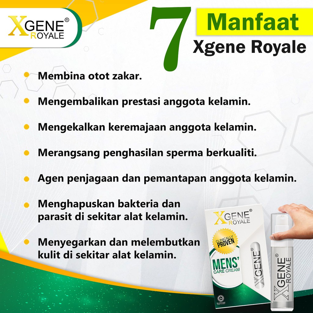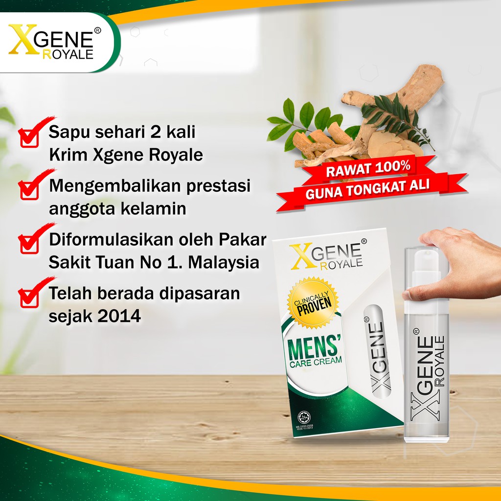 Sapu pada zakar sebelum beraksi Selepas anda membuat foreplay anda boleh sapu krim Xgene Royale pada zakar anda dan mula untuk mendayung. Xgene Royale is the only one in the Malaysian market that is. Kesan pengunaan Xgene Royale dapat dilihat dalam tempoh 3 ke 7 hari jika ia digunakan hari-hari selepas mandi.
